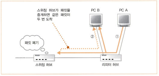 그로 인해 기기 전체에서 중계할 수 있는 패킷의 수는 스위칭 허브가 리피터 허브보다 많다.