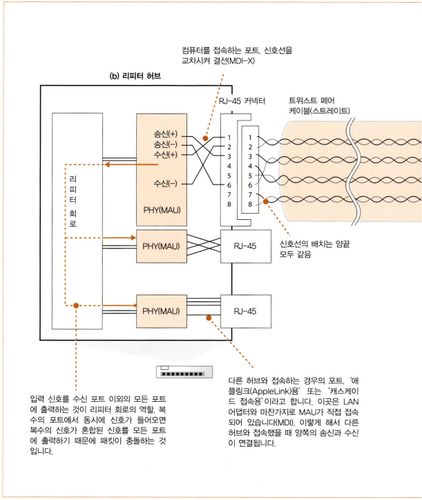 리피터 허브 내부 각 커넥터의 안 쪽에는 PHY(MAU) 회로와 역할이 같은 회로가 있으며, 송신 단자에서 보낸 신호를