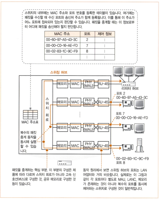 스위칭 허브는 패킷을 중계할 때 MAC 주소표의 내용을 갱신하는 역할도 수행한다.