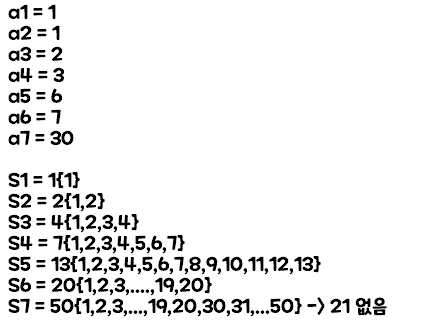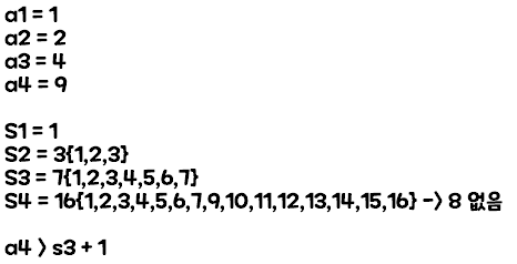 an > S(N-1) + 1 일때, S(N-1)+1 이 측정할 수 없는 최소 무게가 된다.