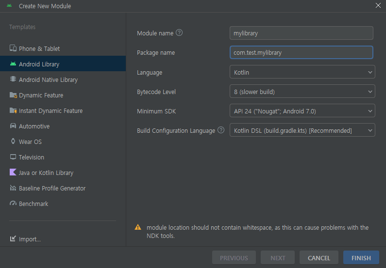 위의 창이 나타나게 되면, Module name에 생성할 Module의 이름을 적고 Finish를 누르면 된다.