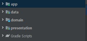 App 모듈의 경우 어플리케이션의 진입점으로, 나머지 Data, Domain, Presentation 모듈을 포함하고 어플리케이션을 빌드하는 역할을 한다.